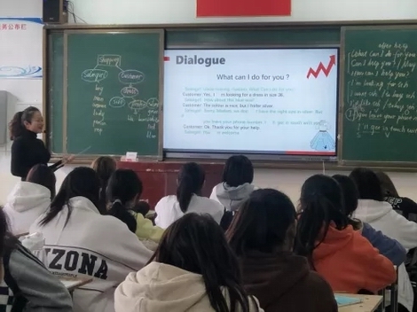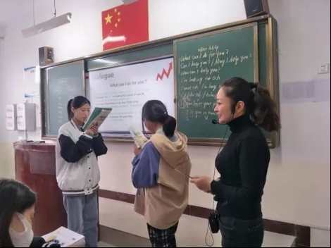 课堂上王瑾老师通过单独示范与多遍带读的方式纠正学生单词的发音,让学习趣味横生;通过拆分法讲解长句,化难为简,帮助学生掌握句型的功能与用法;采取角色扮演的方式指导学生随堂对话,让学生在练习中提升口语表达。教学始终贯穿“礼”,以服务中的“礼”,联系到自身作为教师的“礼”,最后引发学生思考自己在平时应做到的“礼”,潜移默化中让学生受到启发。课堂上王瑾老师精美的PPT、标准的发音、抑扬顿挫的语音语调、丰富的神态和表情、优美的板书都深深地吸引了听课的学生和老师。
