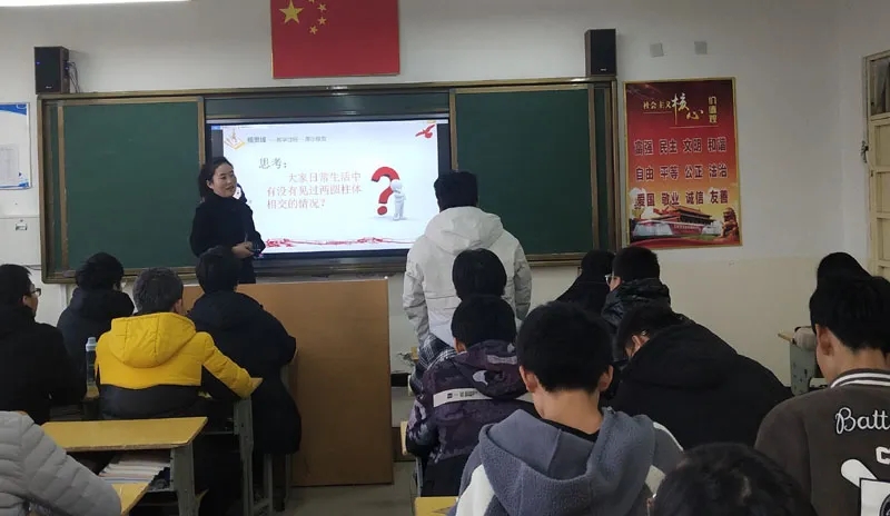 课堂上,梁晓梅老师利用故事视频导入新课,激发学生学习兴趣,运用多媒体教学手段播放图片、动图、视频,将抽象的“相贯线”知识直观展现,采用分组研讨比赛等多种方式调动学生学习主动性,使学生全程参与教学中。课堂上对学生研讨结果给予肯定、分析、补充等有效评价,使学生对新知识有更明确认知。