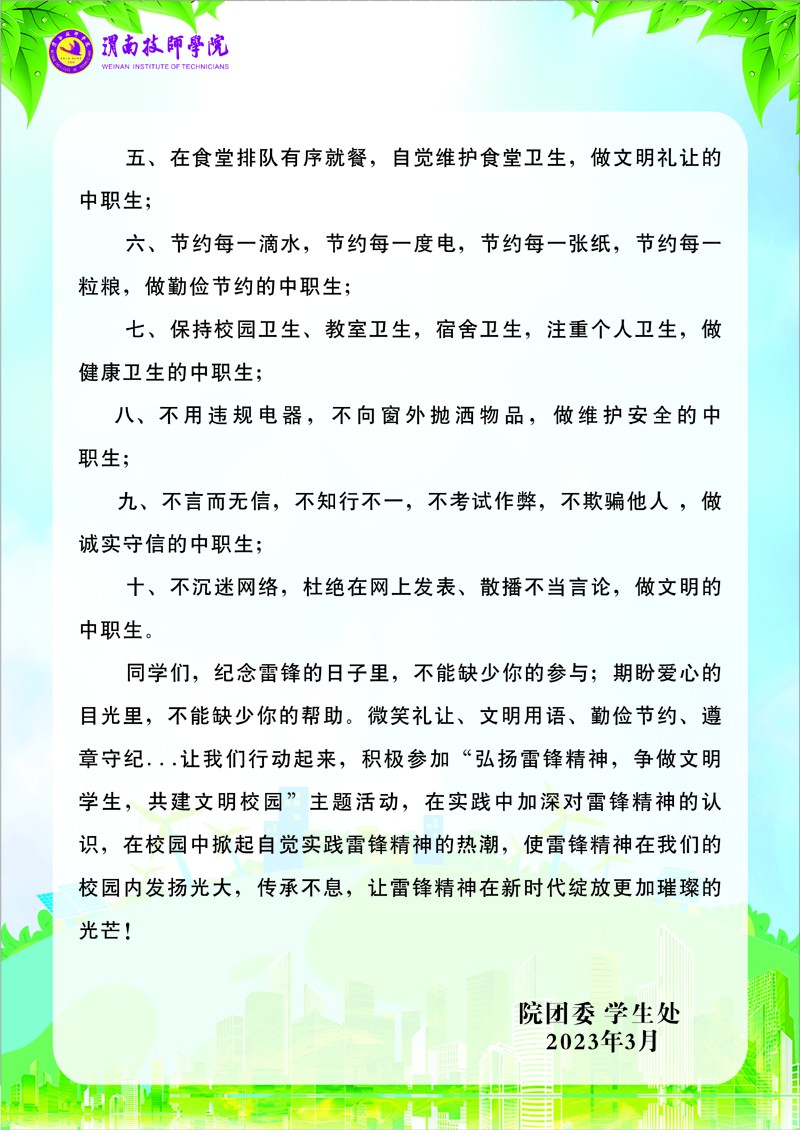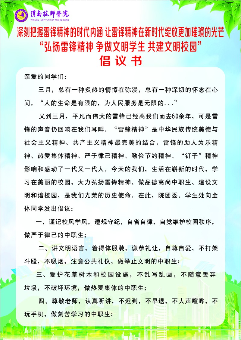 “弘扬雷锋精神 争做文明学生 共建文明校园” 倡仪书