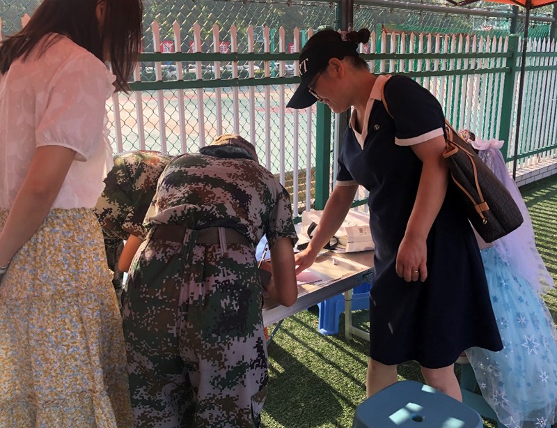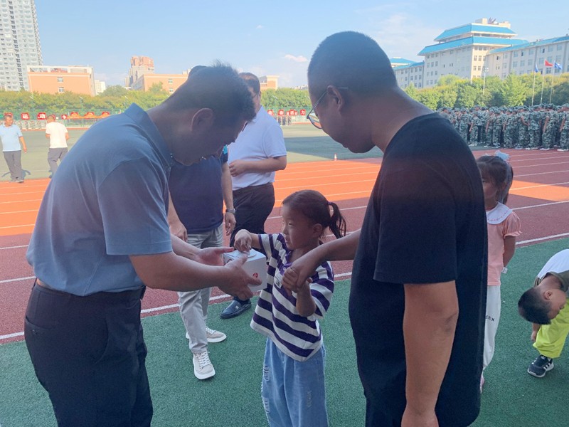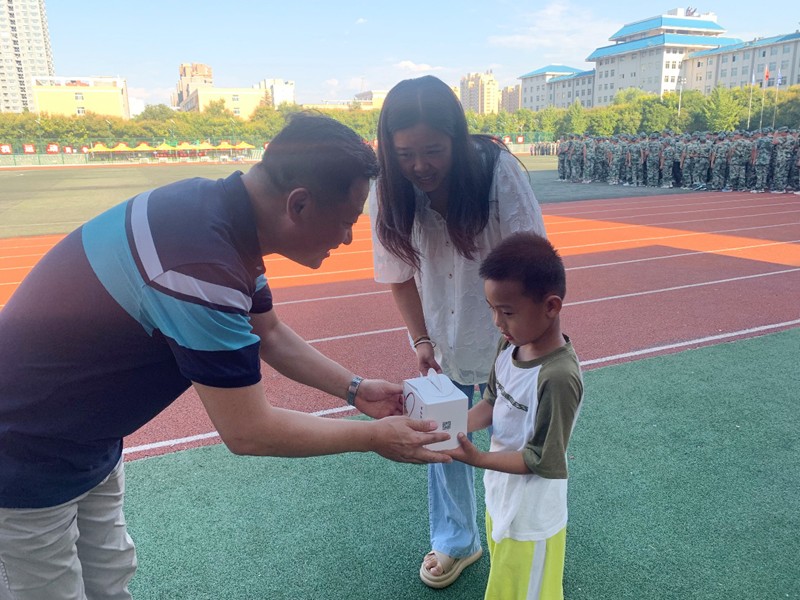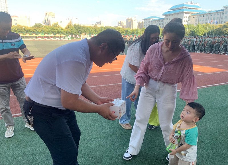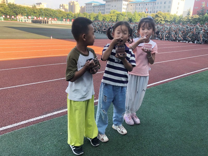 为了表达对各位班主任老师的敬意和感谢,学生处代表院党委为老师们送上解暑的饮品,为小朋友送上甜美的蛋糕,孩子们开心的笑容感染了军训场上的每一个人。