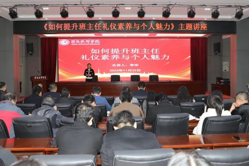 为大力弘扬中华传统文明礼仪,切实提高班主任、教官团队、学工干部等人员的礼仪素养和管理艺术,增强学生习礼、知礼、守礼、行礼意识,11月22日,我院特邀陕西开放大学副教授、国家高级礼仪培训师李华老师为全体班主任、教官团队、学工干部做了主题为“如何提升班主任礼仪素养与个人魅力”的专题讲座;为学生代表做了主题为“德诚于中,礼行于外——文明礼仪伴我行”的专题讲座。讲座分别由学生处处长李峰和副处长王展绘主持。