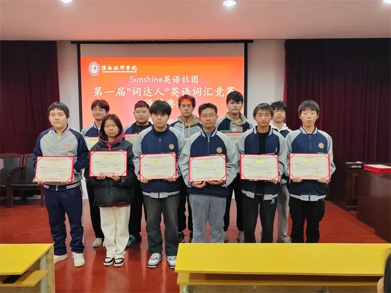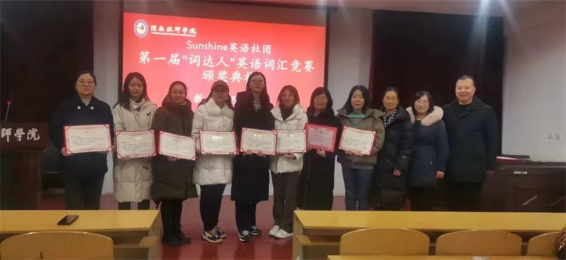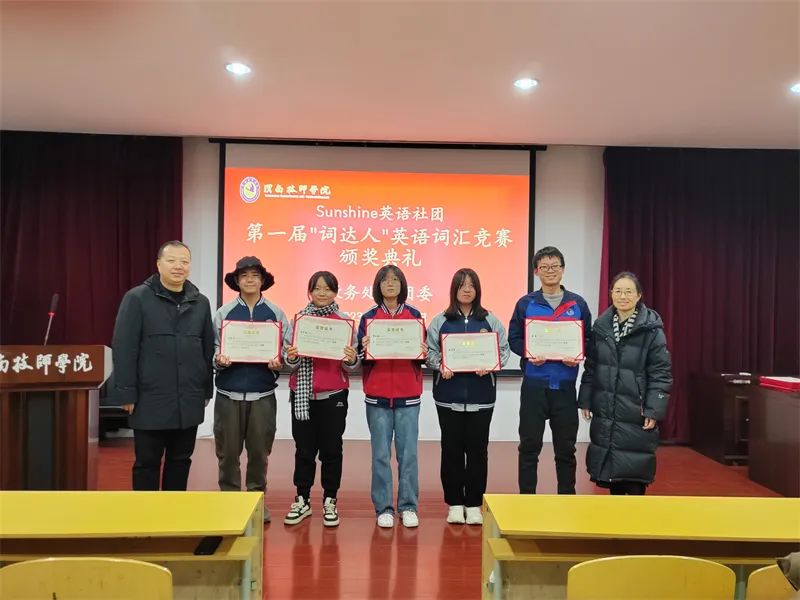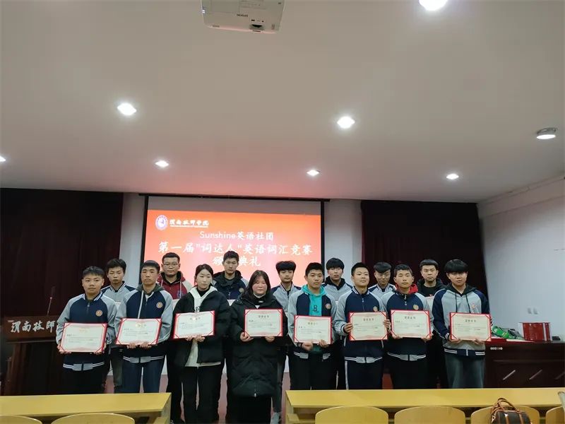 在大家的共同努力下,本次词汇竞赛圆满结束。12月11日下午在三楼多媒体会议室举办了颁奖仪式,教务处副处长杨亚楠、院团委副书记、学生处副处长杨晓琪、教务处教学副科长刘荣及全体英语社团教师为获奖选手颁发了荣誉证书及奖品。